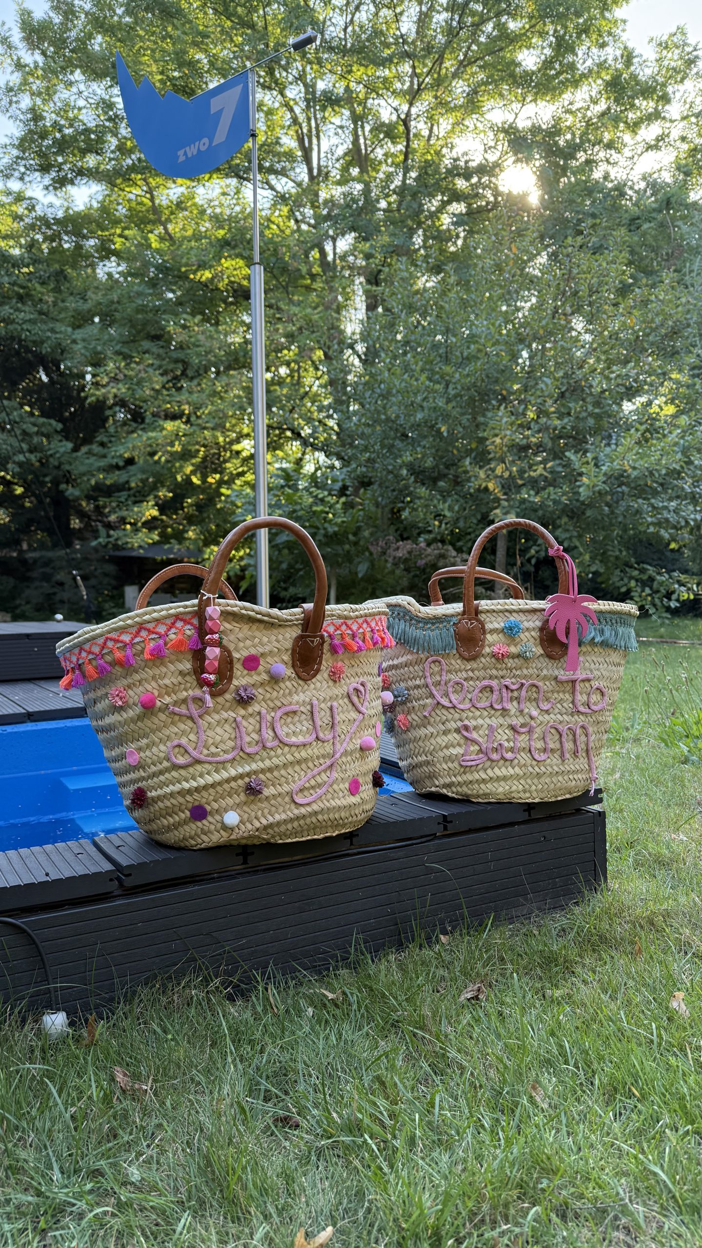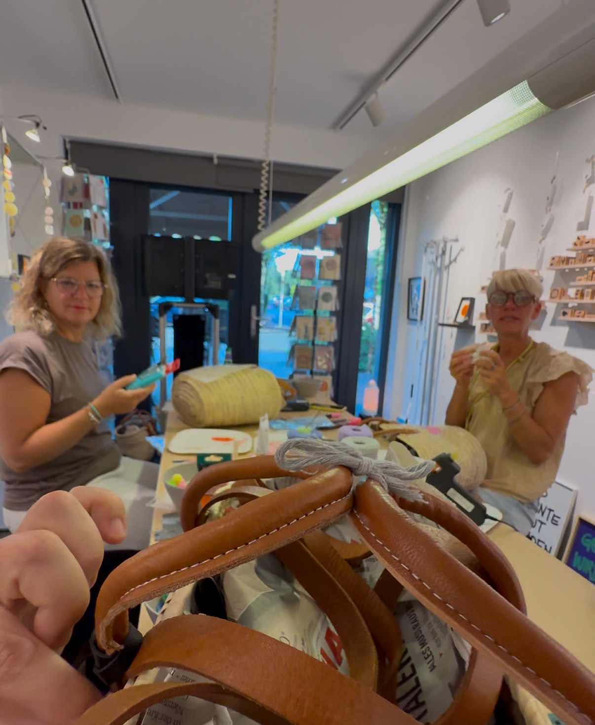 Du arbeitest mit verschiedensten Materialien und kannst aus einer Vielzahl an Verzierungen und Dekoelementen wählen: Bommeln, Fransen, Spitze, Neonfarben, Buchstaben, Kordeln – alles ist möglich! Nina unterstützt dich bei der Ideenfindung, Farbwahl und Umsetzung, sodass am Ende des Abends deine ganz persönliche It-Bag entsteht. Die Strandtasche im Ibiza-Style ist aus natürlichen Doum-Palmblättern geflochten und ist ca. 50 cm breit, 20 cm tief und 26 cm hoch. Die Griffe und die Trageriemen sind aus echtem Leder.